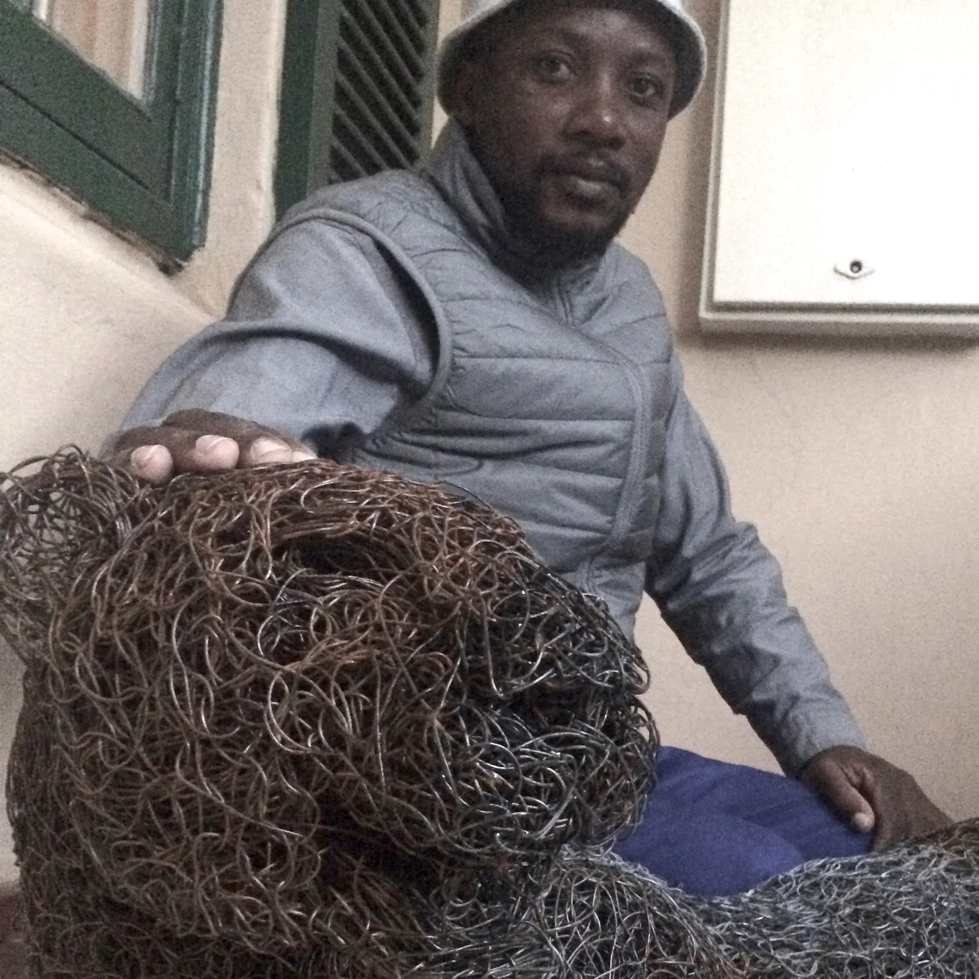Mwazha is originally from Harare in Zimbabwe, he started to making wire art at the age of 7, making toys for himself and his friends. In 1998 Mwazha moved to South Africa, first selling his work on the side of the streets, but soon became known in the art world for his wire portrait sculptures of Nelson Mandela and Muhammad Ali. Mwazha worked for many years as the lead artist of the famous social organization Streetwires. He has done many commissions and exhibitions throughout South Africa, winning several awards. . Including first prize at the Democracy X exhibition (2004), the Brett Kebble art awards, AMS Give Them Wings exhibition and the 9th Cape Town Design Indaba (2006).
